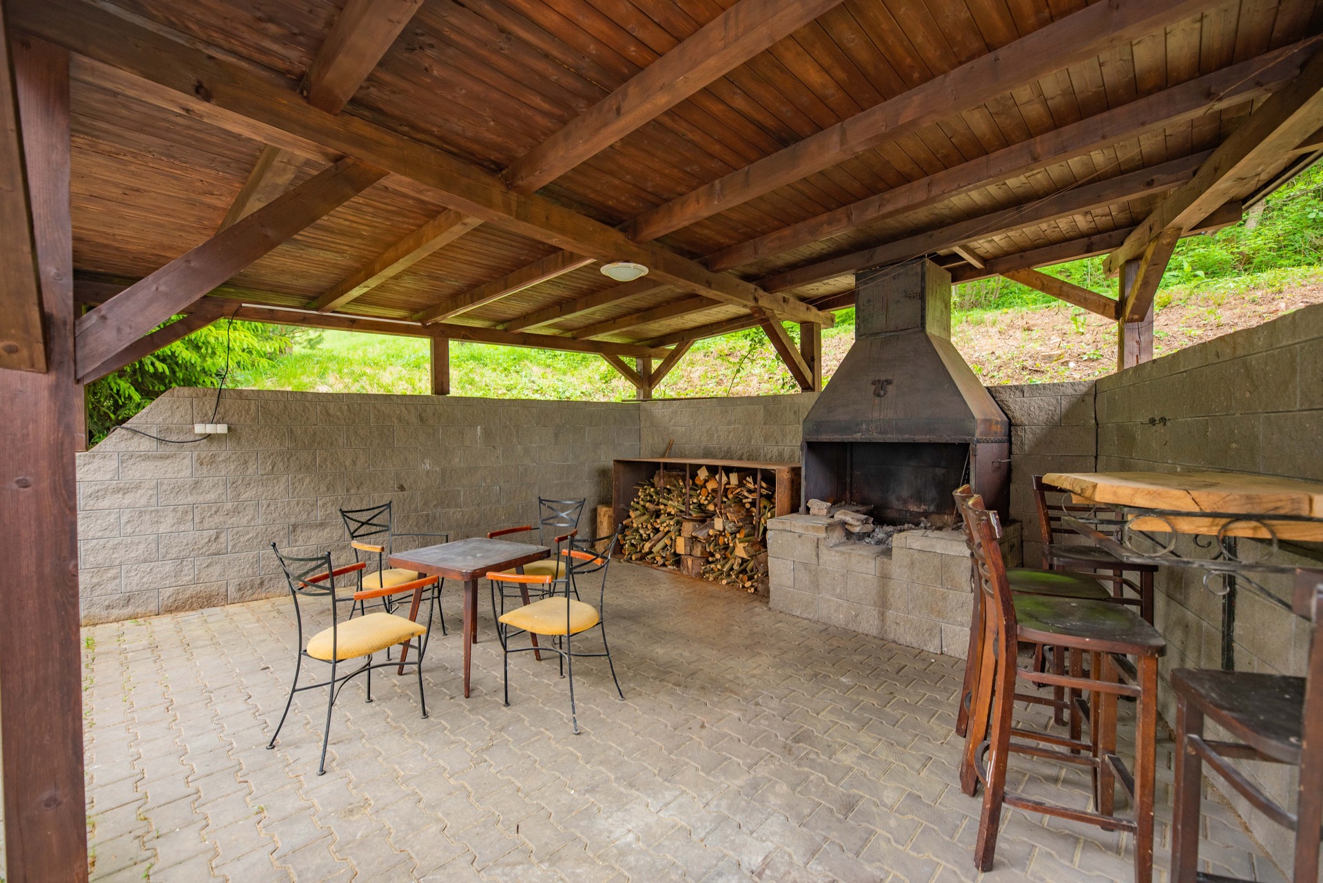 Na zahradě si můžete odpočinout ve velké pergole s grilem a krbem. Zahrada má včetně parkoviště 615 m2 kde se bez problému vleze i dětské hřiště.