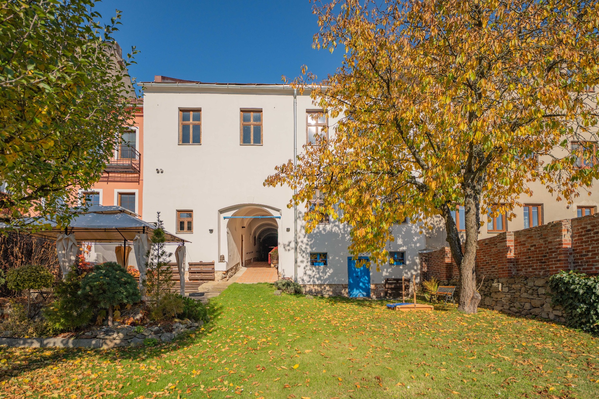 Za domem se rozkládá zahrádka ukrytá před ruchem náměstí, ideální pro relaxaci, posezení s přáteli nebo jako venkovní zóna pro hosty cukrárny. Průchod z ulice zároveň zajišťuje pohodlný přístup i praktické propojení všech částí objektu.