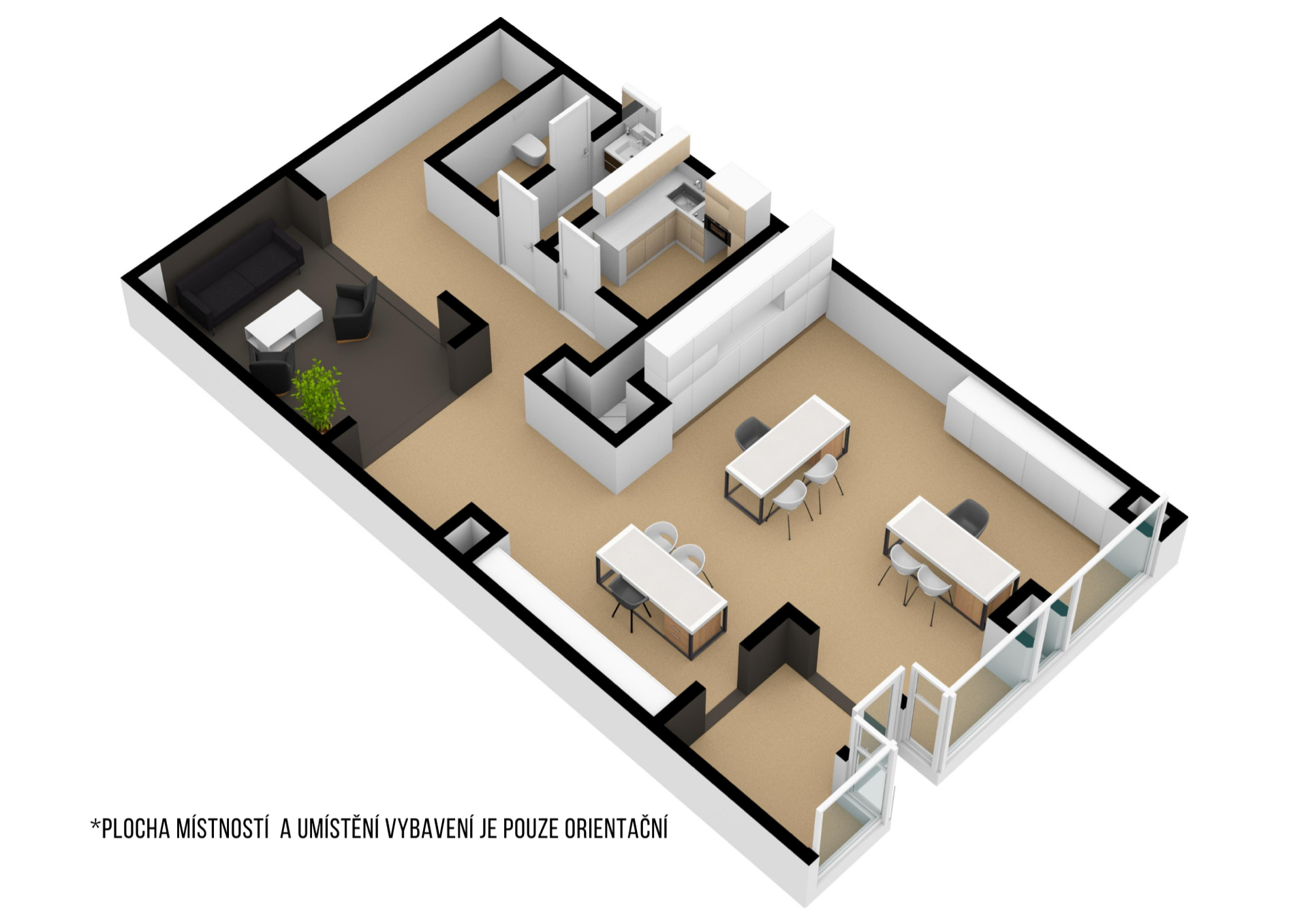 V zadní části najdete nové wc s umyvadlem, místnost s kuchyňkou v béžové barvě, ve které ještě nikdo nesvačil ani neohříval oběd. Vyvýšené pódium je vhodné k pracovním schůzkám, nebo odpočinku. Open space pro zaměstnance, či spolupracovníky, kde se vejdou minimálně tři kancelářské stoly. Výloha má připravenou konzoli pro upevnění televize, kde můžete celý den vysílat svoje myšlenky do světa.
