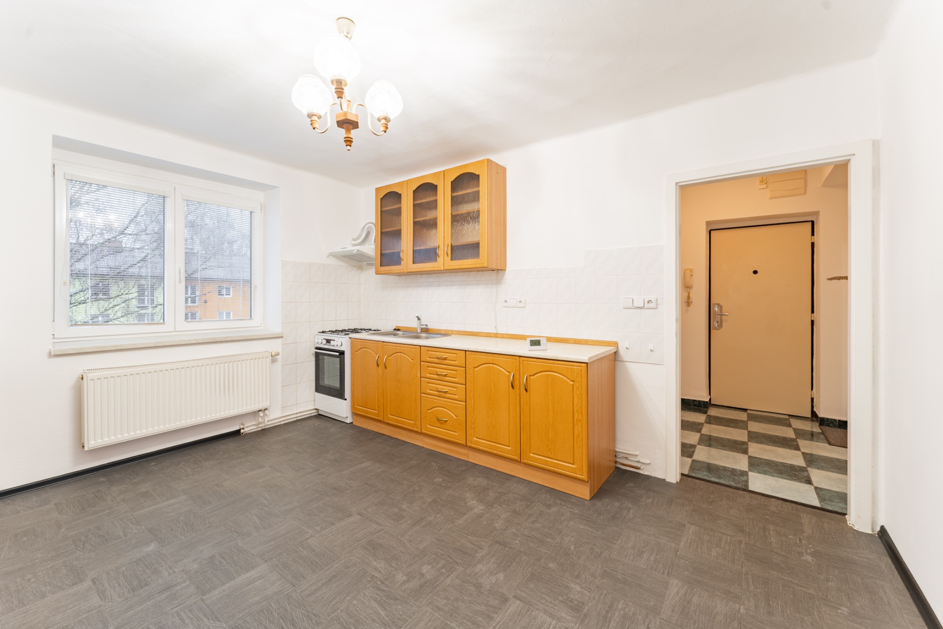 Dispozice bytu je praktická a funkční – dvě samostatné místnosti, kuchyně, koupelna a WC. Vytápění i ohřev vody jsou řešeny vlastním plynovým kotlem, což umožňuje efektivní kontrolu nad náklady. K bytu náleží také sklep, který poskytuje další úložný prostor.