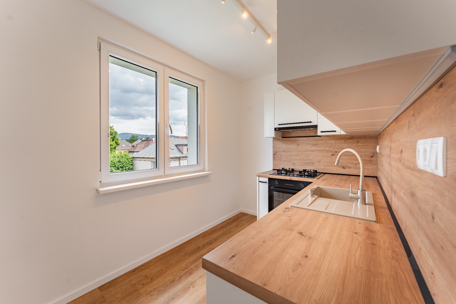 V koupelně se nachází sprchový kout, umyvadlová skříňka se zrcadlem a je zde prostor a příprava na pračku, toaleta je osazena geberitem. V kuchyni najdete na míru vyrobenou kuchyňskou linku s vestavěnou troubou, plynovou varnou deskou, digestoří a myčkou. Obývací pokoj disponuje vstupem na balkon, ideální pro ranní kávu nebo relaxaci, a je průchozí do ložnice a dětského pokoje.