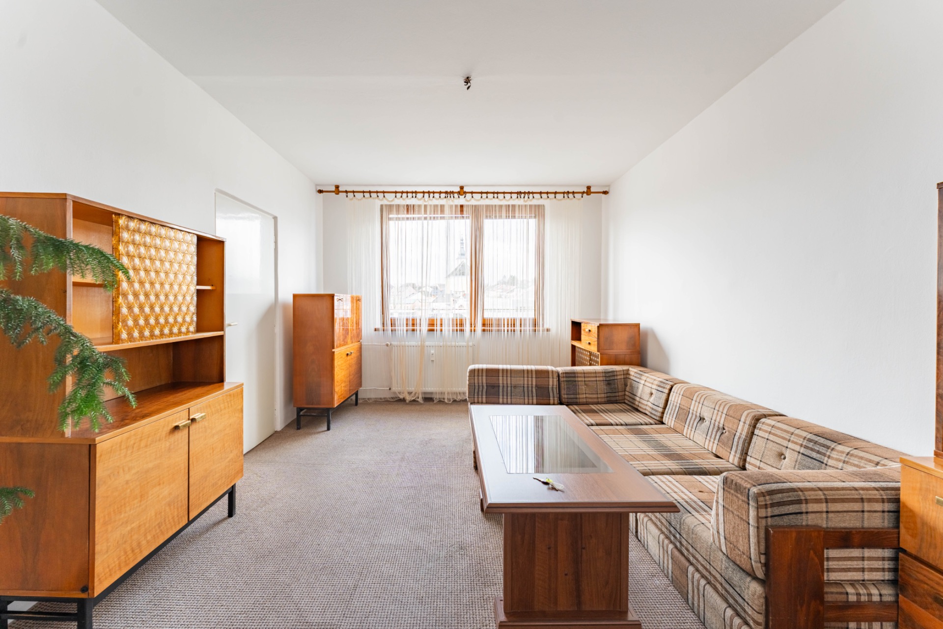 Dispozice je řešena velmi prakticky. Po vstupu do bytu se nachází chodba, ze které se dostanete do obývacího pokoje. Kuchyň je vybavena kuchyňskou linkou, plynovým sporákem a lednicí V koupelně najdete sprchový kout, umyvadlo se zrcadlem a pračku. Dále v bytě naleznete dva prostorné neprůchozí pokoje přičemž jeden z nich nabízí vstup na lodžii. Velkou výhodou je samostatná šatna v bytě, která nám nabízí spoustu úložného prostoru.