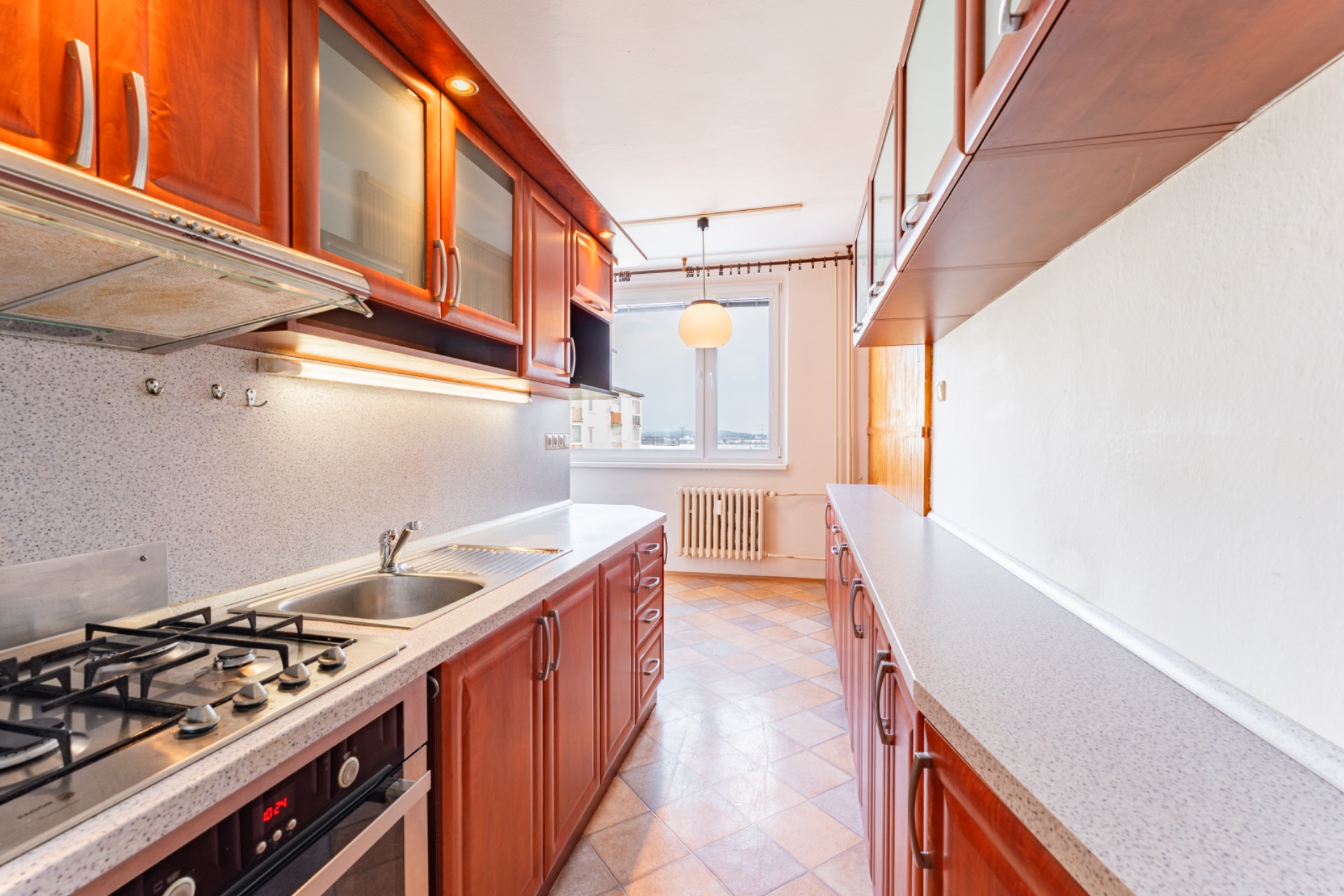 Byt je ve velmi zachovalém stavu. Dispozice zahrnuje koupelnu s toaletou, kuchyni s jídelním koutem a tři pokoje, z nichž jeden je průchozí. Z jednoho pokoje je vstup na zasklenou lodžii. Praktická šatna potěší každého, kdo ocení dostatek úložného prostoru. Součástí je také sklepní kóje.