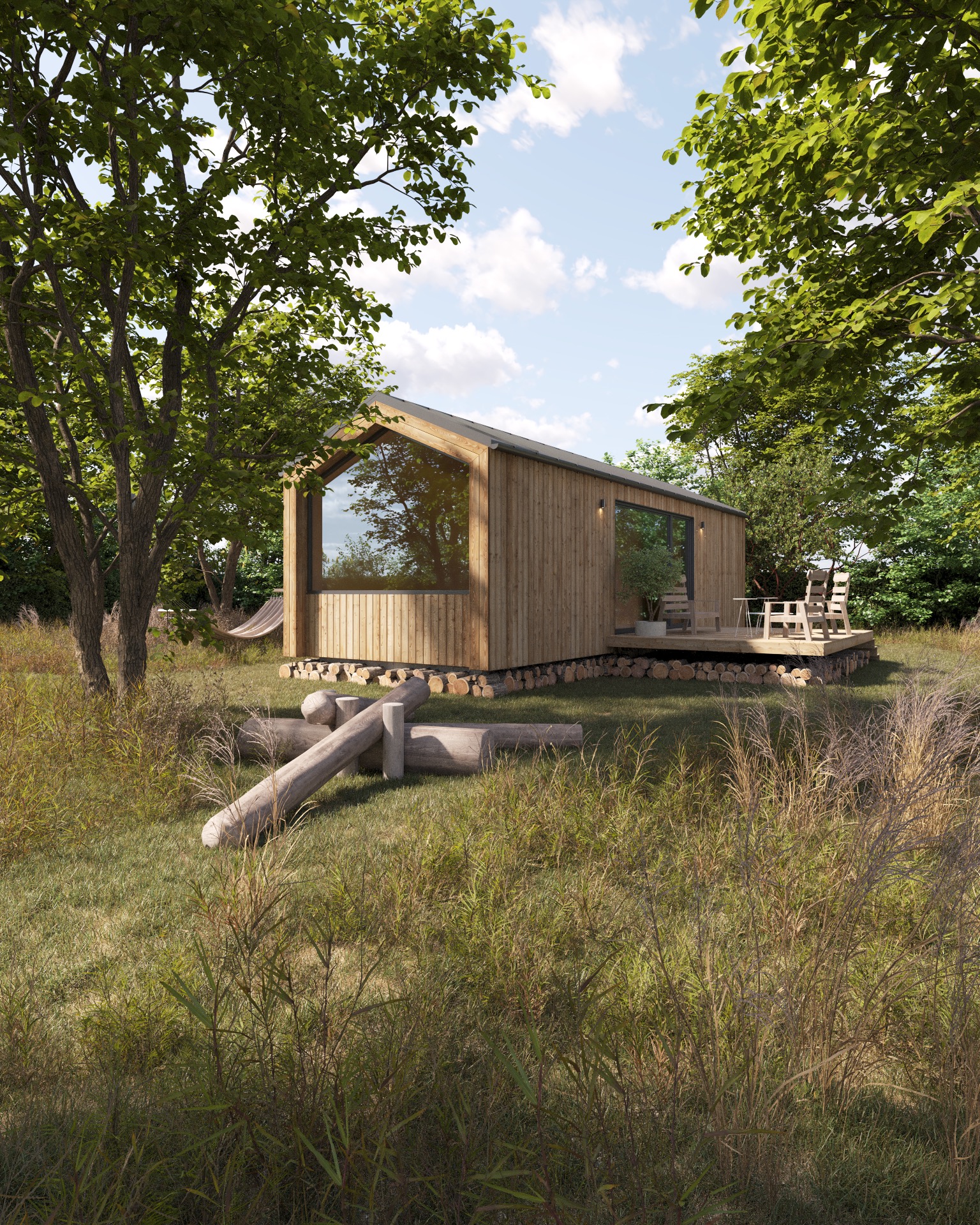 Tiny House je vyroben z přírodních materiálů – konstrukci tvoří masivní smrkové dřevo, fasáda je ze sibiřského modřínu. Velká okna zajišťují dostatek denního světla a spojení s okolní krajinou. Díky zateplení je vhodný k celoročnímu užívání. Vytápění je řešeno tepelným čerpadlem a krbovými kamny.